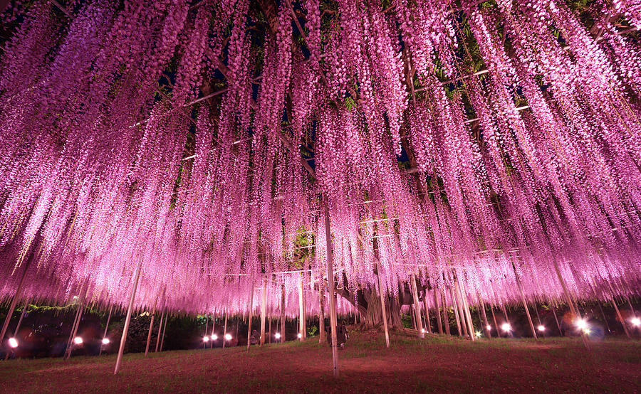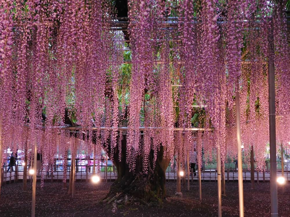 Theo tiếng Nhật, hoa tử đằng được gọi là fuji. Loài hoa này có đủ màu sắc rực rỡ như xanh dương, hồng, trắng, vàng và phổ biến nhất là màu tím. Du khách sẽ được chiêm ngưỡng “đường hầm hoa” trải dài 100 m đẹp mắt tạo nên từ hàng trăm gốc dây leo hoa tử đằng dưới bàn tay khéo léo của nhiều người. Bạn có thể sững sờ trước vòm hoa hệt chiếc đèn chùm khổng lồ tím biếc của cây cổ thụ gần 150 năm tuổi. Đêm xuống, dàn hoa tử đằng trong rực rỡ và lộng lẫy hơn bởi hiệu ứng của hệ thống đèn chiếu sáng. Khung cảnh lúc này đẹp tuyệt, khiến bạn ngỡ như lạc bước vào bức tranh cổ tích.