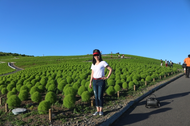 Những bụi cây Koicha trứ danh ở Công viên Hitachi vào mùa này đang có màu xanh. Đến tháng 10, chúng sẽ chuyển sang màu đỏ rực