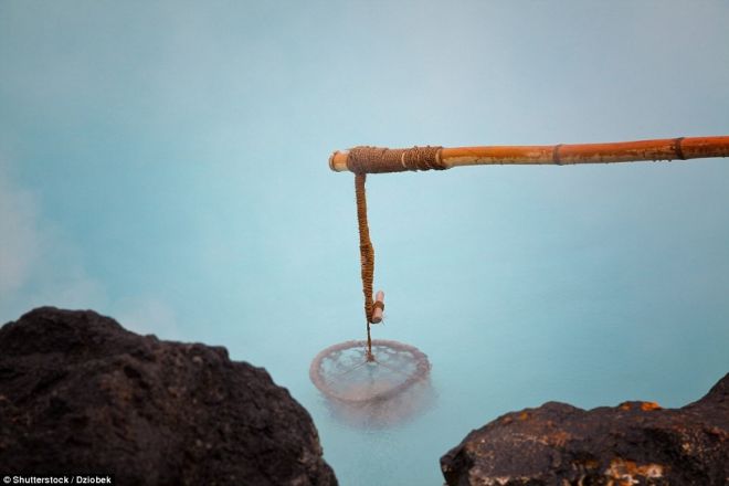 Rổ trứng đang được luộc trong suối nước nóng ở Sea Hell.