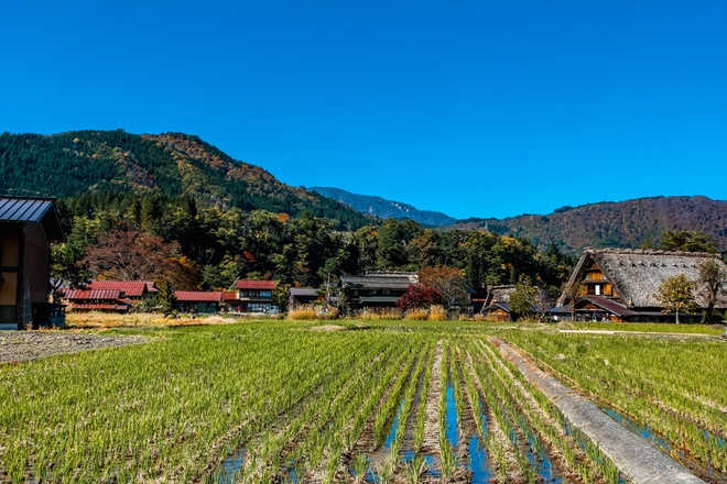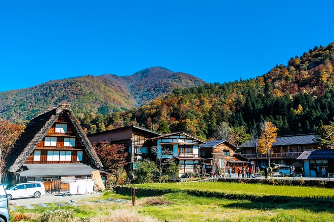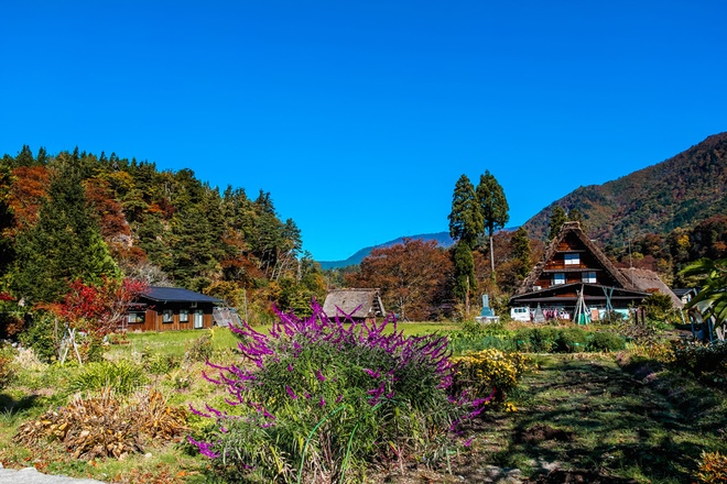 Ngôi làng Shirakawa-go trong những ngày trời thu xanh ngắt với những ngôi nhà bao phủ bởi cỏ lau cao vút, phía sau là mảng rừng cây đủ màu đỏ, vàng, xanh của thiên nhiên.