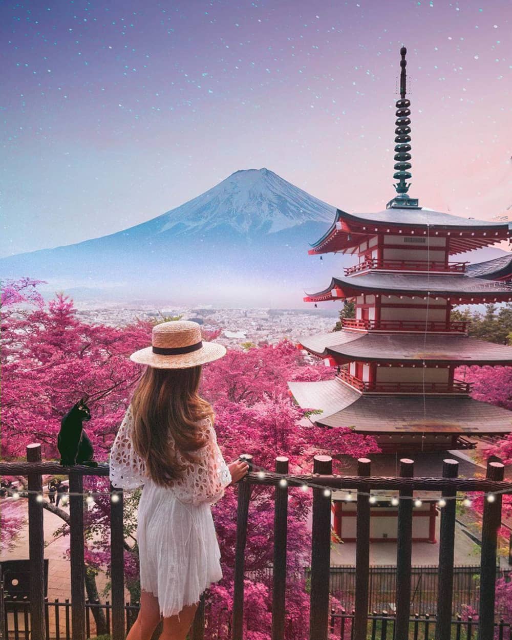 Để lên đến chùa Chureito, du khách phải vượt qua hành trình dài khoảng 397 bậc. Hình ảnh núi Phú Sĩ, ngôi chùa đỏ, hoa anh đào nở rực cả một góc trời đã trở thành một trong những hình ảnh hoàn hảo về đất nước Nhật Bản trong tưởng tượng của rất nhiều khách du lịch nước ngoài đến với đất nước. Ảnh: Molllified, Herrokelly.