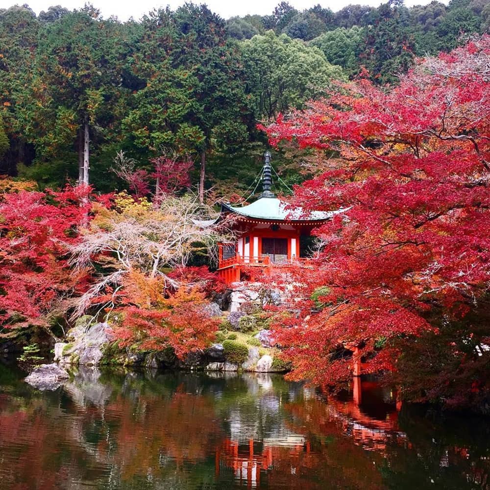 Một trong những cảnh được chụp ảnh nhiều nhất ở khu vực Hạ Daigo là hội trường Bentendo. Công trình nằm trên một hòn đảo nhỏ, bao quanh bởi hồ nước đẹp như tranh vẽ và những cây phong núi, bạch quả. Vào mùa thu, lá phong nhuộm đỏ cả một góc trời kết hợp với sắc đỏ son của đền Bentendo và cây cầu bắc qua ao nước khiến du khách tới đây không thể không trầm trồ. Ảnh: Aliceneko0618, yuriugaya.