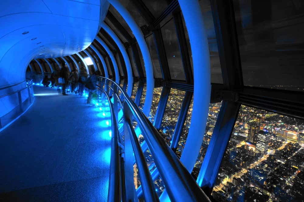- Sàn kính: Hãy cùng tận hưởng cảm giác bước đi trên sàn kính cường lực, chịu nhiệt dày 12 mm và thưởng lãm quang cảnh trải ra ngay dưới chân bạn. Khung cảnh ngoạn mục và vẻ đẹp tráng lệ qua khung thép của Tokyo Skytree có thể khiến bạn say mê hoặc… kinh hãi.