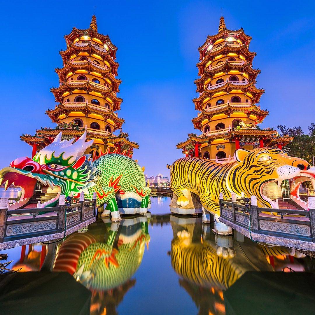 Cao Hùng, Đài Loan (Trung Quốc) được biết đến với chùa chiền, lầu ngắm cảnh, chợ đêm tấp nập. Khi ghé thành phố này, nhiều du khách không thể bỏ qua Long Hổ tháp, công trình biểu tượng của đầm Liên Trì nổi tiếng. Long Hổ tháp gồm hai tòa tháp 7 tầng (rồng và hổ) xây đối xứng, đứng vững chải giữa đầm nước mênh mông. Ảnh: Asiaglobalvacation, kanakamuni.