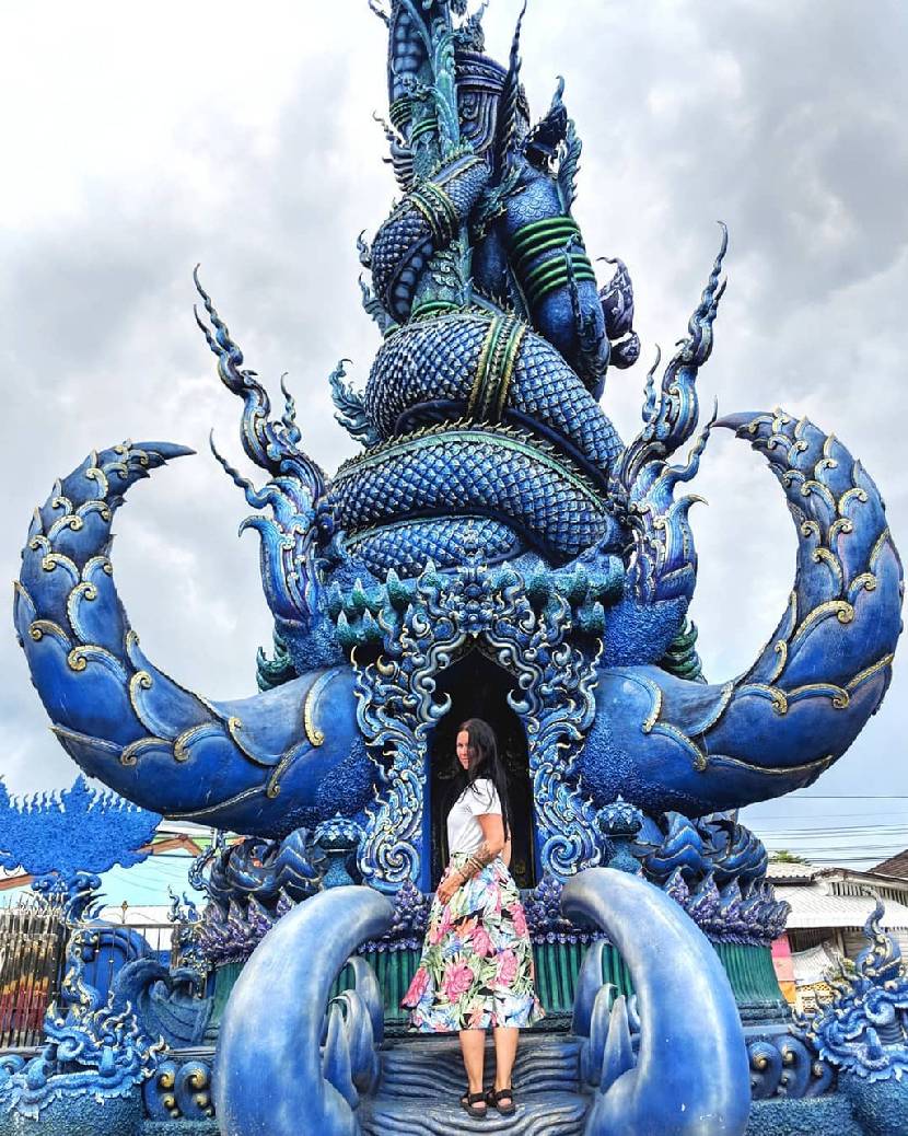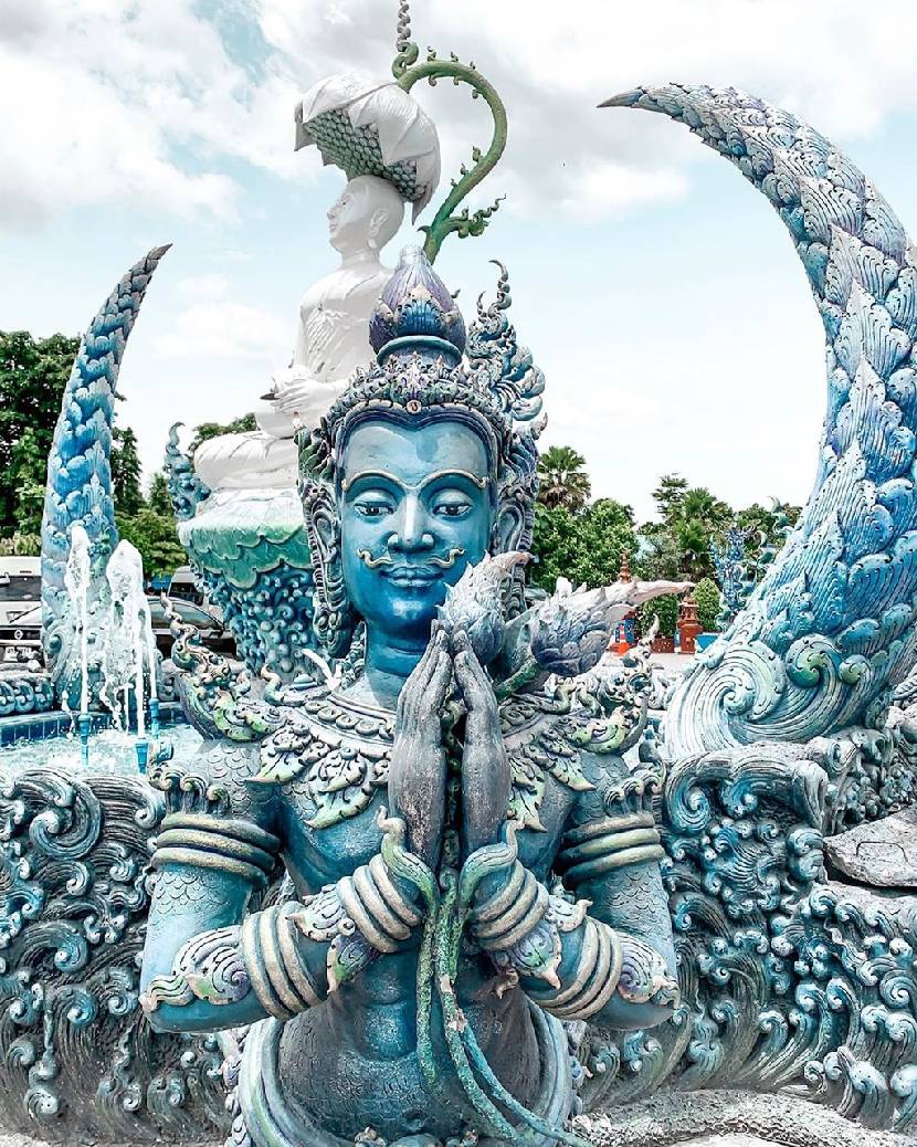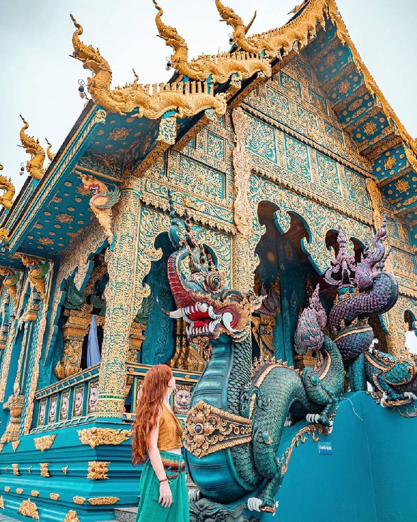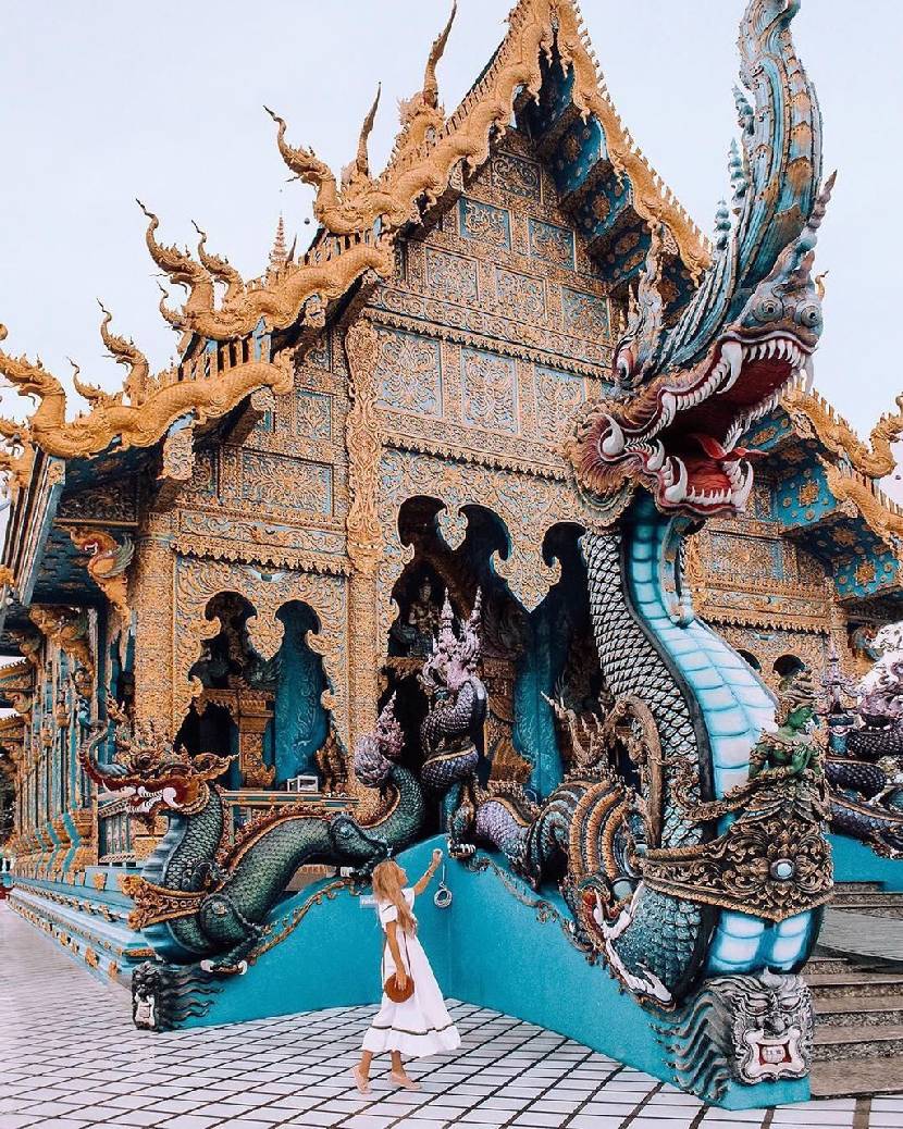 Cách trung tâm thành phố Chiang Rai (Thái Lan) khoảng 3 km là ngôi chùa Wat Rong Seur Ten lộng lẫy với sắc xanh đậm thu hút du khách ghé thăm. Công trình Wat Rong Suer Ten độc đáo được cải tạo từ một ngôi đền cổ bị bỏ hoang, có nguồn gốc từ hơn 100 năm trước. Đến Chiang Rai, bạn cũng có thể ghé thăm chùa trắng Wat Rong Khun mang nhiều nét tương đồng từ phong cách chọn màu chủ đạo đến những con rồng uốn lượn trên mái tinh xảo. Ảnh: Auburnroe, audra_taraske, cooltraveltrip, thetravellingnomads.