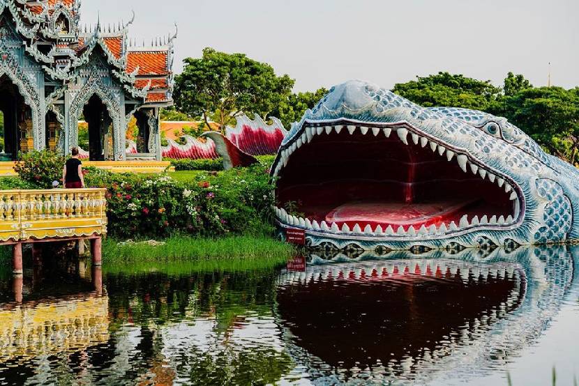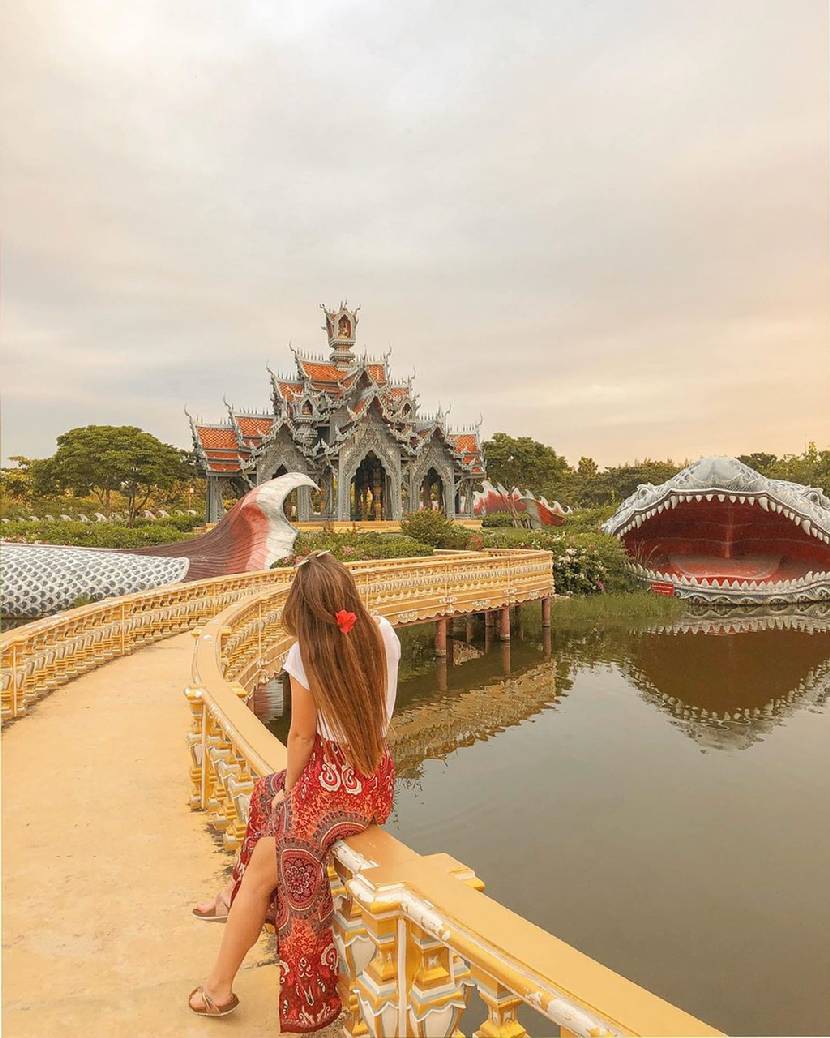 Nằm cách thủ đô Bangkok (Thái Lan) khoảng 30 km, công viên Ancient City được ví như xứ chùa vàng thu nhỏ với nhiều bản sao tái hiện lại các công trình kiến trúc đất nước này. Nổi bật nhất trong quần thể phải kể đến đền Sumeru với con cá Anondha khổng lồ bao quanh, trấn giữ. Theo truyền thuyết, cá Anondha là loài cá ma thuật, tượng trưng như một linh vật bảo vệ ngôi đền khỏi những điều xấu xa từ bên ngoài. Đền Sumeru được xem là kiến trúc vĩ đại, hoành tráng Thái Lan. Ảnh: Kankankavee, dreamtravelerphotos, a.cuppa.chai.