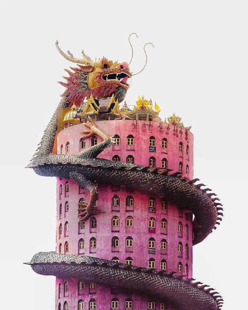 Đền Wat Samphran nằm cách Bangkok (Thái Lan) khoảng 40 km là công trình tôn giáo mang kiến trúc ấn tượng, độc lạ. Ngôi đền phủ sắc hồng nổi bật và con rồng khổng lồ uốn quanh đầy quyền uy. Ý nghĩa bí ẩn của hình tượng con rồng thu hút du khách khắp thế giới. Ở đây còn có loạt tác phẩm điêu khắc được làm tỉ mỉ, mang đậm ý nghĩa tâm linh khiến bạn bất ngờ trong hành trình khám phá. Ảnh: Atlasobscura, travel_rust, travel_rust, moumitamaity.