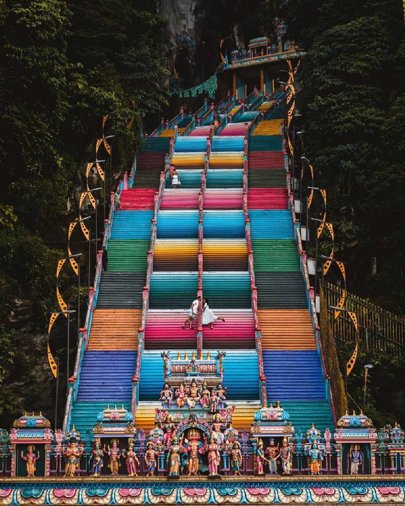 Hang động Batu được biết tới là một trong những khu điện thờ Hindu nổi tiếng nhất Malaysia. Ẩn mình sau sự xô bồ của thủ đô Kuala Lumpur, hang động nằm bên trong núi đá vôi khoác lên mình lớp áo màu sắc rực rỡ, ấn tượng. Du khách đến đây tham quan không chỉ được check-in sống ảo với nấc thang tuyệt đẹp mà còn có thể tham quan ba hang động nổi tiếng. Để khám phá động, bạn phải bước qua 272 bậc thang lên hang Cathedral (điện thờ lớn). Ảnh: Mapping.along, page28travel.