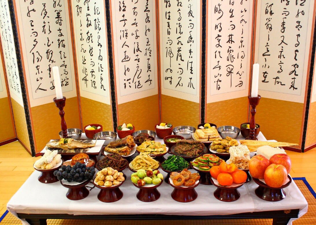 Trong ngày lễ Chuseok, người Hàn sử dụng các sản phẩm mới gặt hái được như thịt, cá, rau, hoa quả, bánh gạo... để chế biến các món ăn thành kính dâng lên tổ tiên. Tất cả mọi người đều mặc những bộ trang phục truyền thống đẹp nhất.