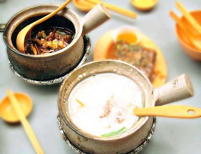 Đến Singapore, bạn cũng không thể bỏ qua món cháo ếch, một trong những niềm tự hào của văn hóa ẩm thực Singapore. Tuy được bán khắp nơi nhưng nổi tiếng nhất cho món này vẫn là khu Geylang. Geylang tập trung khá nhiều du khách Việt đến thưởng thức, phổ biến đến độ một vài bảng hiệu ở đây còn được đề bằng tiếng Việt bên dưới. Cháo ếch Singapore thường được phục vụ thành hai thố. Một thố cháo trắng sánh dẻo và một thố thịt ếch kho với đầu hành, tiêu và hỗn hợp gia vị đậm đà, thơm cay.