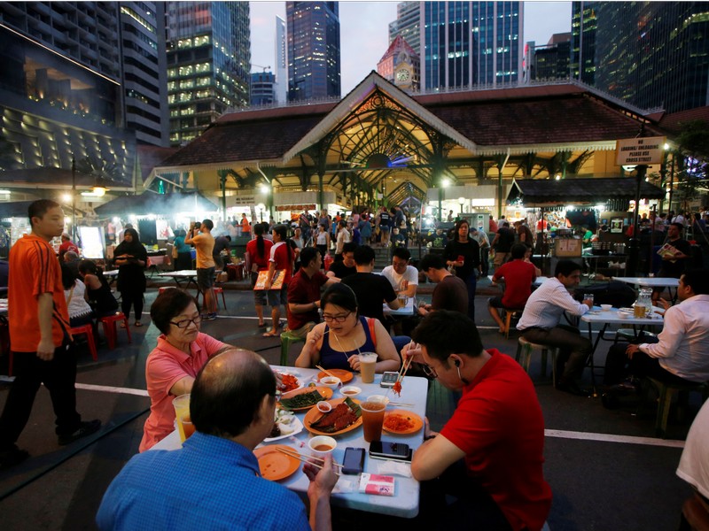Singapore có khá nhiều các khu ẩm thực ngoài trời tập trung nhiều quầy hàng bán rong, tại đây du khách có thể lựa chọn hàng trăm món ăn hấp dẫn.
