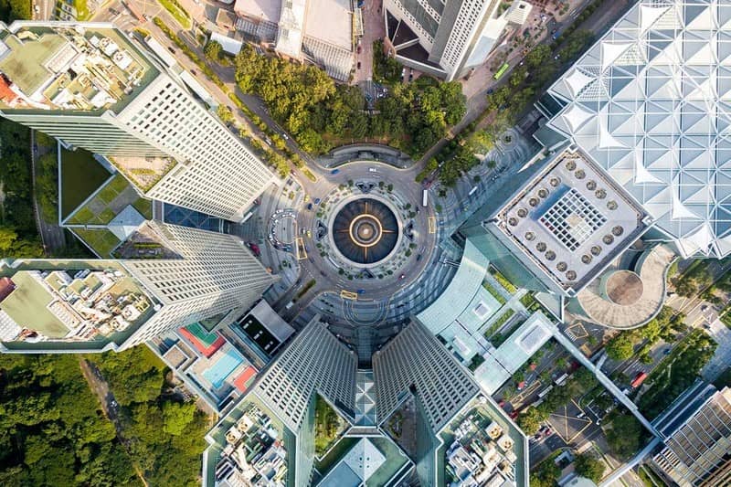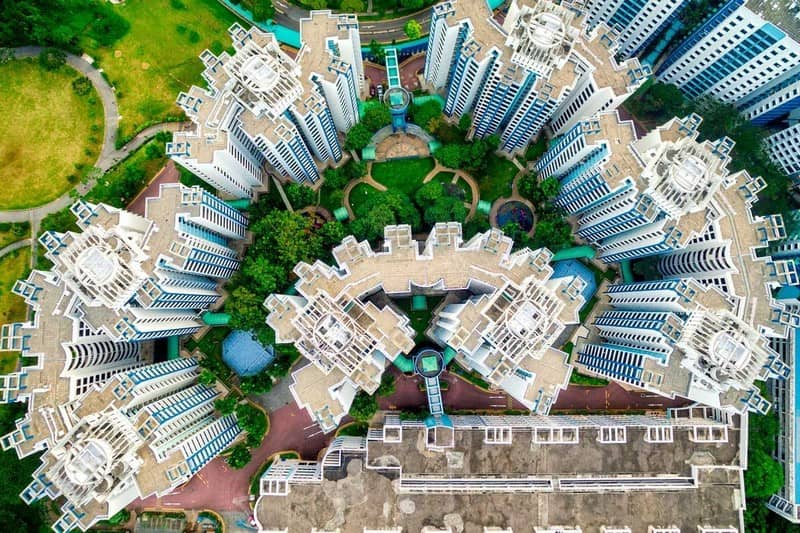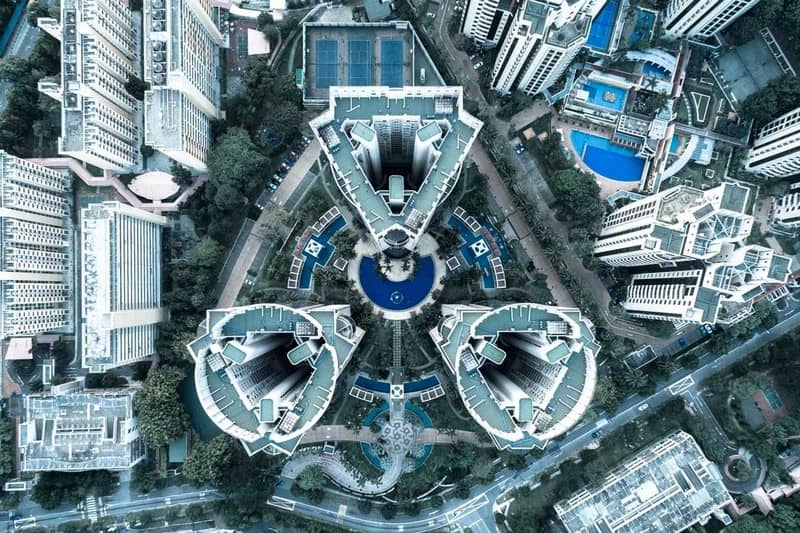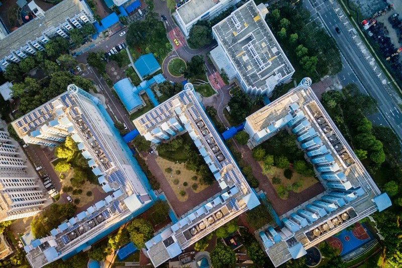 Thiết kế của các tòa nhà hiện lên gọn gàng và quy củ qua góc ảnh từ trên cao.
