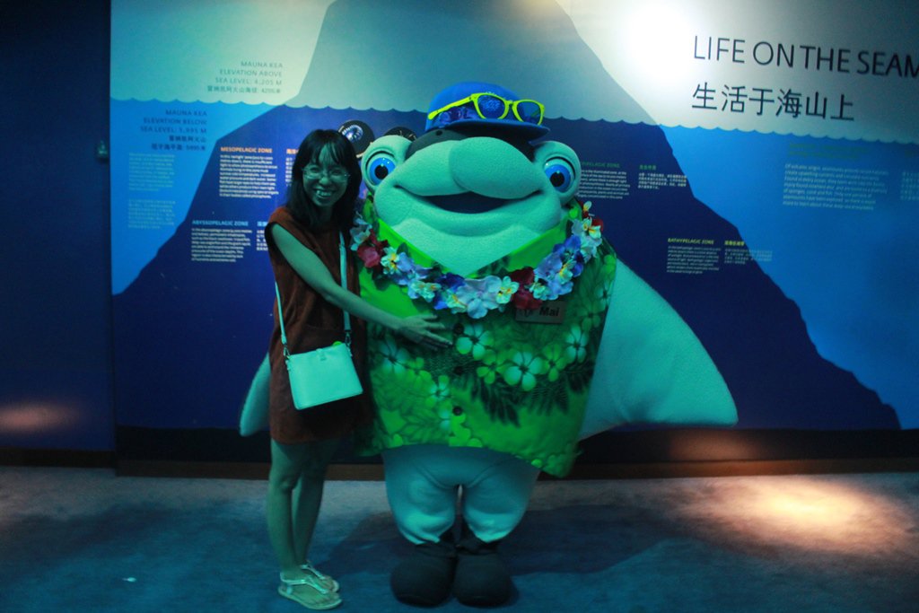Du khách hào hứng khi chụp hình với Mai – một linh vật của thủy cung S.E.A. Aquarium. Mai xuất hiện hai lần một ngày tại khu Ocean Dome vào lúc 14:45 và 15:45 để chụp hình cùng du khách.