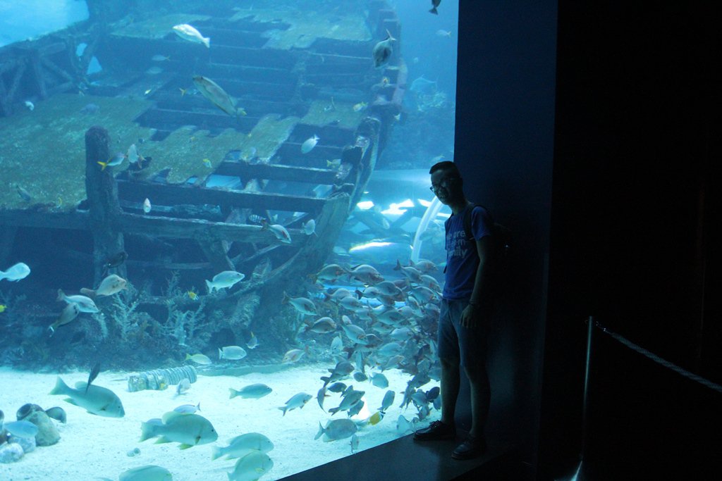 Trong số đó, khu thu hút nhiều người ghé tham quan nhất là bể cá khổng lồ nằm ngay khu vực trung tâm. Bể cá được tạo thành bởi nhiều tấm kính trong suốt, cao 8,3 mét và rộng 36 mét. Khách tham quan có thể thoải mái ngắm nhìn các con vật vừa lạ vừa quen như cá mập, cá heo, cá đuối,…