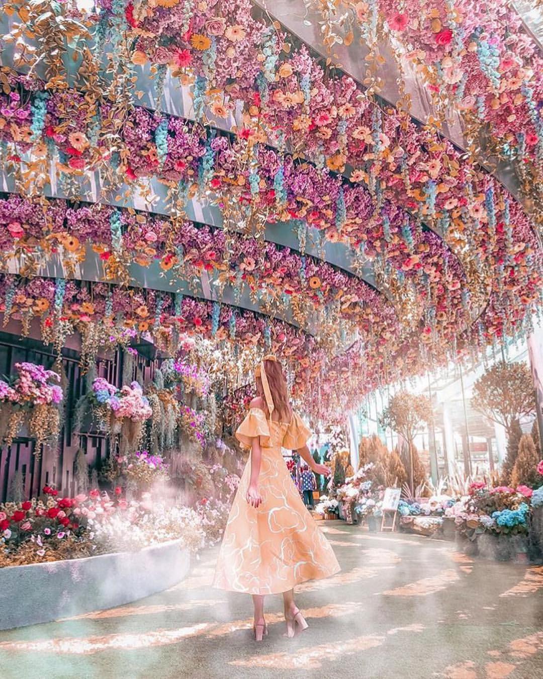 Dù mới mở cửa vào ngày 14 tháng 4, vườn hoa tuyệt đẹp có tên gọi Floral Fantasy này đã thu hút rất nhiều du khách ghé đến chụp ảnh. Khung cảnh với rất nhiều chậu hoa được treo trên cao đã tạo nên phông nền lý tưởng để lên hình ảo diệu và cũng không kém phần sang chảnh. Ảnh: Jujujucloe, Estherksz.