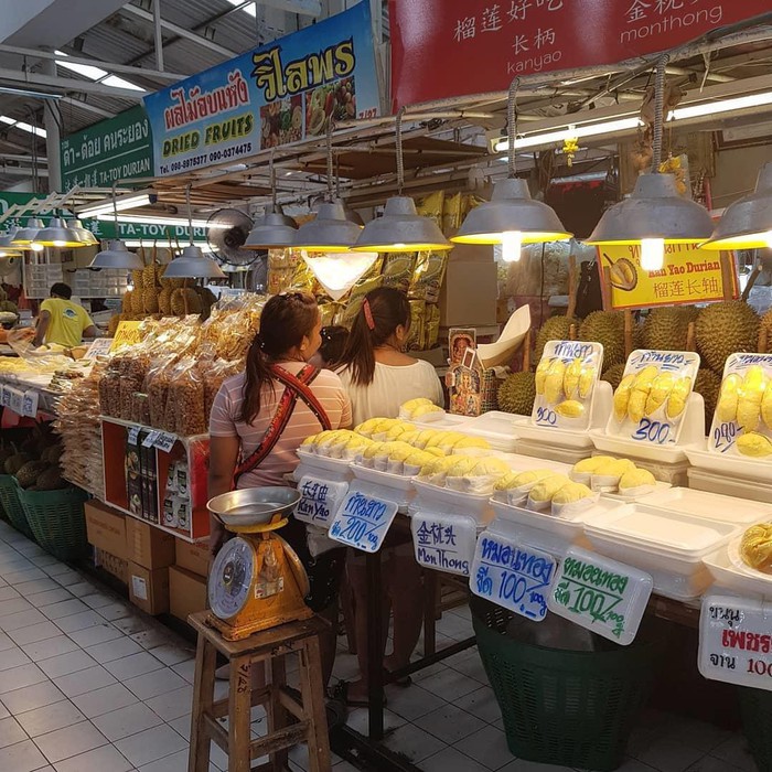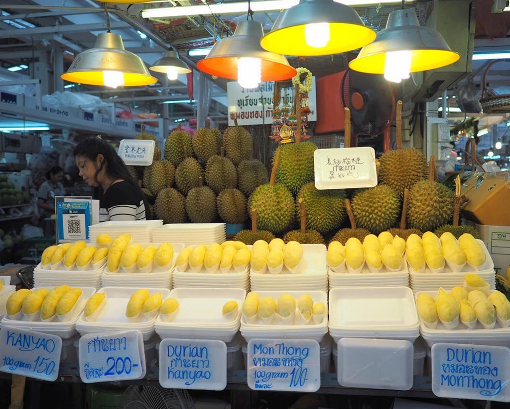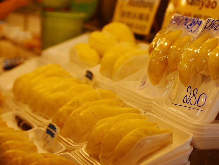 Những sạp sầu riêng chạy dài với giá từ 95-310 USD tuỳ thuộc vào cân nặng của từng quả. Tuy nhiên, từ tháng 4 đến tháng 7 hàng năm, vào đúng thời điểm mùa sầu riêng, bạn có thể mua với giá rẻ hơn.