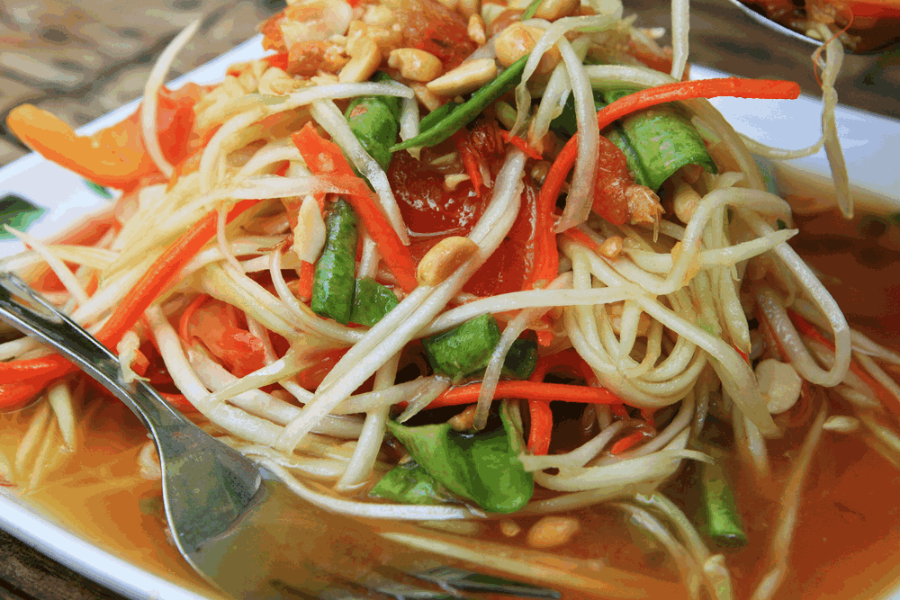 Nguyên liệu của món này gồm đu đủ bào sợi, ớt, tôm khô, cà chua, đậu đũa bẻ nhỏ. Tất cả được cho vào cối giã, sau đó thêm cốt chanh, nước mắm, đường thốt nốt rồi trộn cho gia vị thấm đều vào đu đủ. Vị cay đặc trưng của món ăn Thái sẽ khiến bạn cảm thấy kích thích. Giá mỗi phần Som Tam ở các xe đẩy rong chỉ khoảng 40 – 50 baht (khoảng 30.000 - 40.000 đồng).