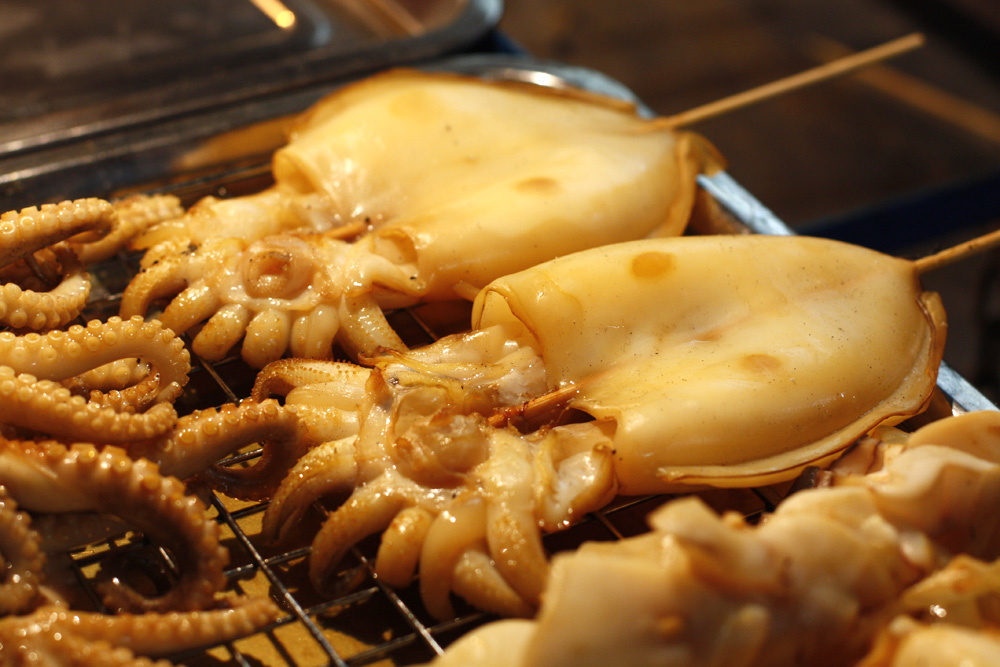 Theo gió, mùi thơm của mực tươi khi được nướng trực tiếp trên bếp than hoa dễ bay xa. Nếu dạo quanh các khu chợ đêm, bạn đừng quên thử món ăn giòn sần sật này. Để tăng mùi vị của món ăn, người Thái Lan rưới lên mực sau khi nướng nước sốt ngọt và cay. Ngoài ra, các hàng này còn bán đủ loại tôm cá viên chiên, thanh cua... cho bạn tha hồ lựa chọn. Tuỳ theo kích thước mà giá của món ăn sẽ dao động.