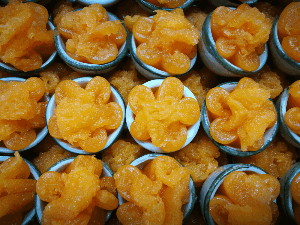 Loại bánh này còn có tên gọi là thong yord hay foi thong. Thông thường, chúng được làm từ lòng đỏ trứng gà trộn với bột và đường. Tuỳ theo đầu bếp mà bánh có nhiều hình dáng khác nhau, có loại dài như sợi, có loại tròn như quả bóng bàn. Hình dạng bông hoa được xem là mất công nhất. Chiếc bánh có giá khoảng 10 - 15 baht (khoảng 7.000 - 10.000 đồng).