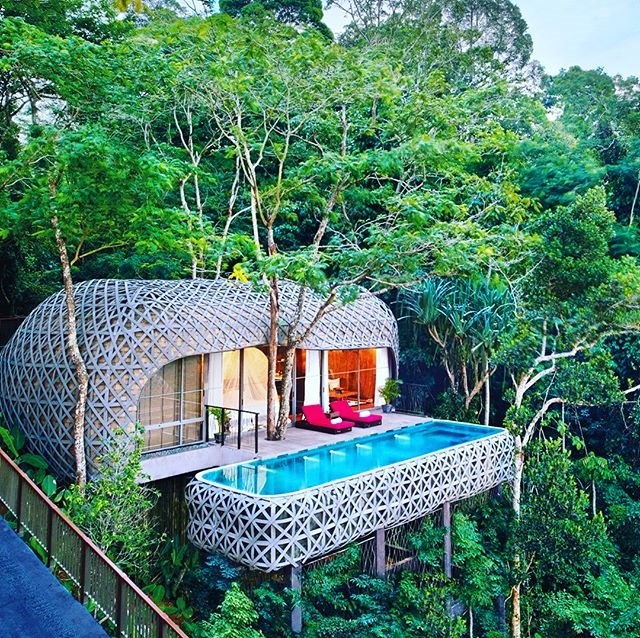 Mỗi phòng của khách sạn tựa như một hang động và những tổ kén, tổ chim nổi bật giữa cánh rừng - một nét sống hoang dã cổ xưa.