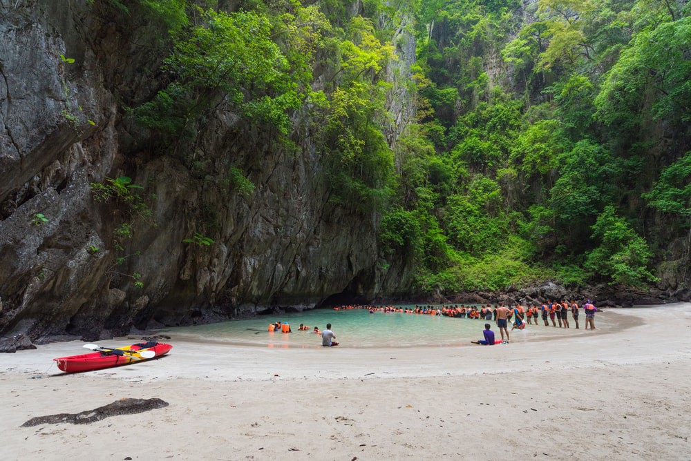 Nằm trên đảo Koh Muk của tỉnh Trang (Thái Lan), bãi biển ở hang Morakot tựa chốn thiên đường cách biệt với thế giới bên ngoài. Để đến đây, du khách phải chèo thuyền từ phía biển, len từ đầu này sang đầu kia của hang. Khi ánh sáng xuất hiện cũng là lúc du khách ngỡ ngàng với cảnh tượng trước mắt. Bãi cát trắng nổi bật trên làn nước trong xanh với 4 bề là vách núi dựng đứng.