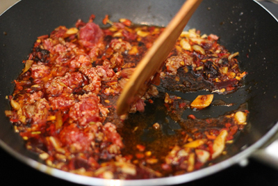 #Bước 3 : Trông nồi gia vị bắt dầu hấp dẫn rồi đây. Giờ bạn cho tiếp thịt xay vào vào. Đảo đều tay. Nhớ đừng quên nêm xì dầu cho vừa miệng đấy.