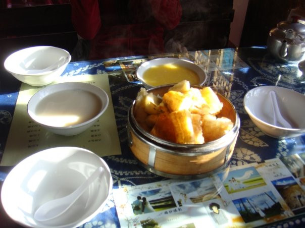 Bánh quẩy và sữa đậu nành: Là món ăn sáng phổ biến của người dân Lệ Giang, bạn dễ dàng nhận ra bánh quẩy và sữa đậu nành có mặt ở hầu hết hàng, quán bán đồ ăn buổi sáng. Bánh quẩy dài, sữa đậu nành thơm và ngon. Nếu thích uống nước ngọt hơn, bạn có thể pha thêm chút đường.