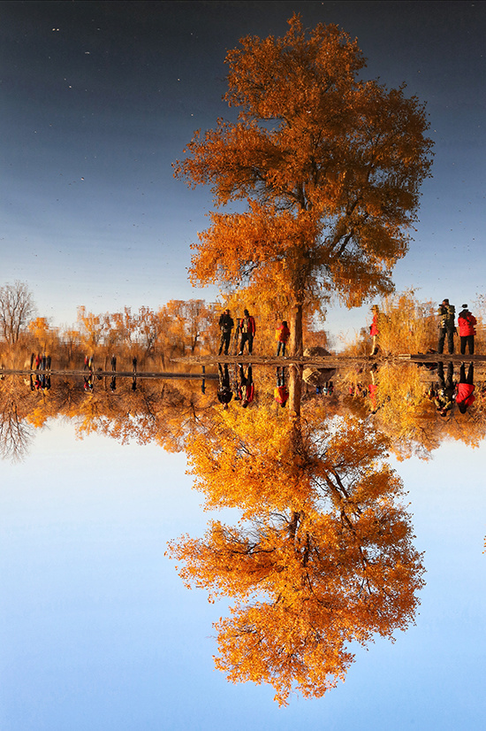 Thu về, Cam Túc còn gây ấn tượng bởi rừng cây hồ dương rực rỡ lá vàng, soi bóng dưới mặt hồ xanh biếc. Cây hồ dương còn gọi là cây hồ đồng, một loại cây cổ thụ có sức sống dẻo dai. Chúng có thể tồn tại trong điều kiện khí hậu khắc nghiệt với nhiệt độ cực cao hoặc cực thấp. Cây có tuổi thọ hàng ngàn năm, cây chết nhưng không bị mục nát. Ảnh: Quỷ Cốc Tử.