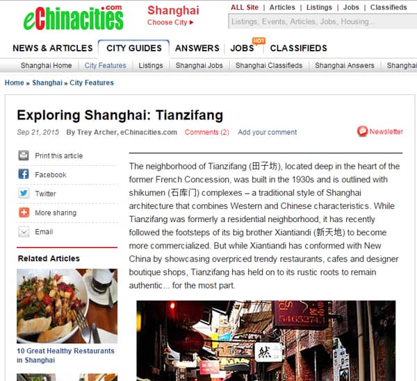 Trong phần City Guides, website cung cấp tư vấn du lịch về 41 thành phố, trong đó chi tiết nhất là về Bắc Kinh, Thượng Hải, Quảng Châu, Thâm Quyến... , chi tiết đến mức bạn có thể tìm thấy những quán ăn, quán cà phê đặc sắc nhất ở khu Tianzifang (Thượng Hải), giờ mở cửa, giá tiền, món nên gọi, định vị trên bản đồ...
