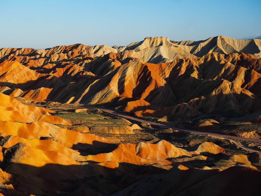 Công viên này nằm ở tỉnh Cam Túc, màu đỏ rực lửa đặc trưng ở đây được hình thành từ những khối đá sa thạch đỏ được bào mòn qua thời gian, khi ánh nắng mặt trời chiếu xuống, chúng sẽ sáng rực lên như cầu vồng.
