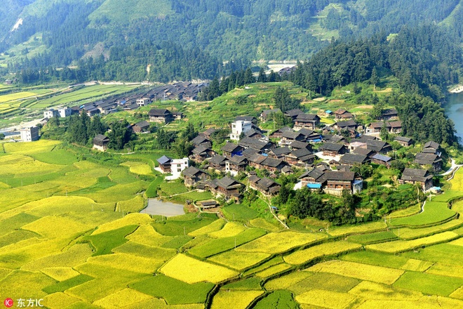 Những đồng lúa ở làng Ping Bao, tỉnh Quý Châu làm khách đường xa mê mải vì sắc vàng rực rỡ khi vào thu.