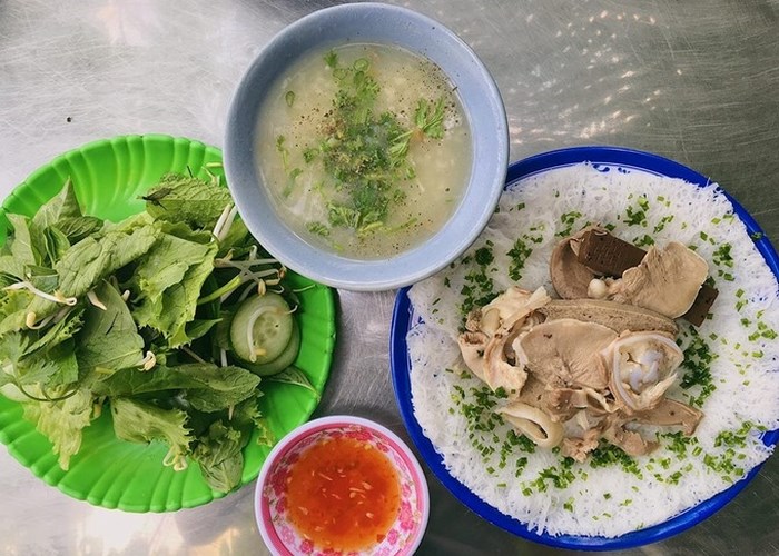 Món điểm tâm khá bình dân, chỉ 20.000 đồng/phần gồm đĩa bánh hỏi lòng heo kèm tô cháo loãng, chấm với nước mắm đậm ớt cay xè chắc chắn sẽ khiến cả những thực khách khó tính thích thú.