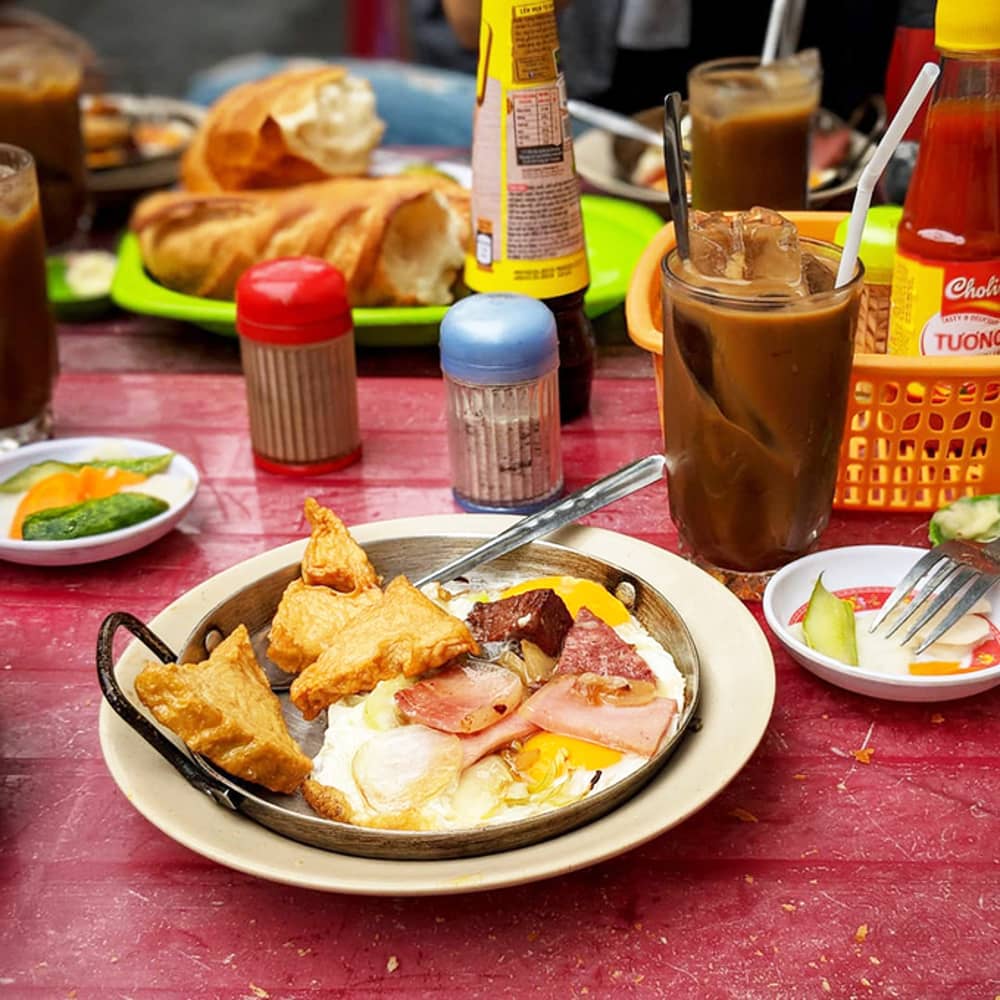 Bạn có thể gọi phần ốp la kèm thịt nguội riêng hay phần thập cẩm, rắc lên ít tiêu, nước tương, tương ớt là bạn có thể thưởng thức. Khách sẽ ngồi trên ghế nhựa trong một con hẻm nhỏ. Giá một phần bánh mì ăn trên chảo từ 40.000 đồng.