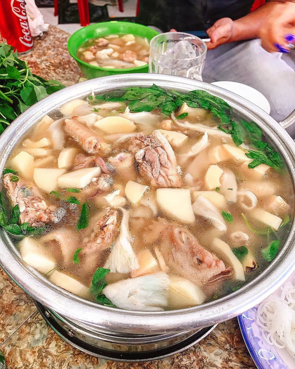 Du lịch Đà Lạt, du khách nào cũng phải ghé ăn lẩu gà lá é ngon trứ danh. Lá é nồng thơm giúp thực khách thêm ấm bụng khi xì xụp nước lẩu. Ngoài thịt gà dai giòn, đồ ăn kèm lẩu có nấm bào ngư, măng chua, lòng mề xào sần sật.
