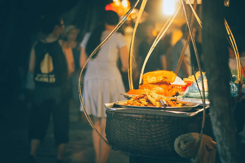 Ẩm thực đêm Hội An cũng rất nhộn nhịp. Những gian hàng ăn đêm chính là một trong những điểm khiến khu phố yên bình thêm sống động. Nơi đây có nhiều món ngon nổi tiếng như cao lầu, bánh tráng, các đồ chiên nướng, hoa quả miền Trung...