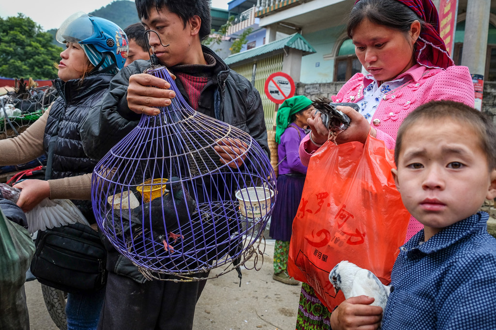 Cậu bé người Mông đang chăm chút cho chú gà của mình. Khu vực mua bán gà tập trung nhiều thanh thiếu niên. Với các cậu bé, chợ là nơi gỡ bạn bè và cho những chú gà của mình “tỷ thí”.