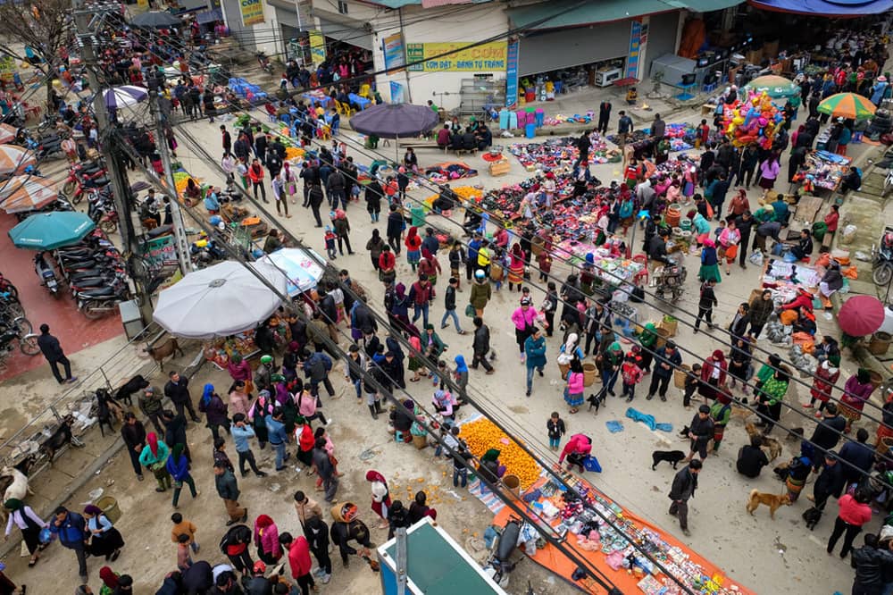 Toàn cảnh khu chợ gia súc của người Mông từ trên cao. Đây là một trong số những chợ trâu bò lớn nhất miền núi phía Bắc, cùng với chợ Phiên Đồng Văn và chợ Bắc Mê.