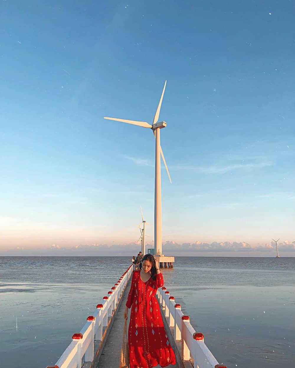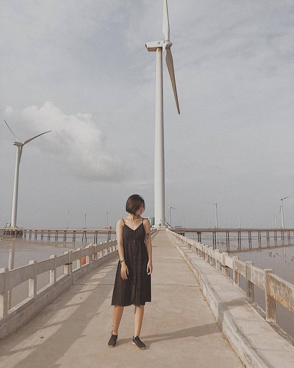 Địa điểm này cách trung tâm thành phố Bạc Liêu gần 20 km. Cách xa công trình chừng 10 km, bạn có thể quan sát được những chiếc "chong chóng khổng lồ" quay đều tăm tắp. Ảnh: leviathanivy2933, hong.hanhnt.