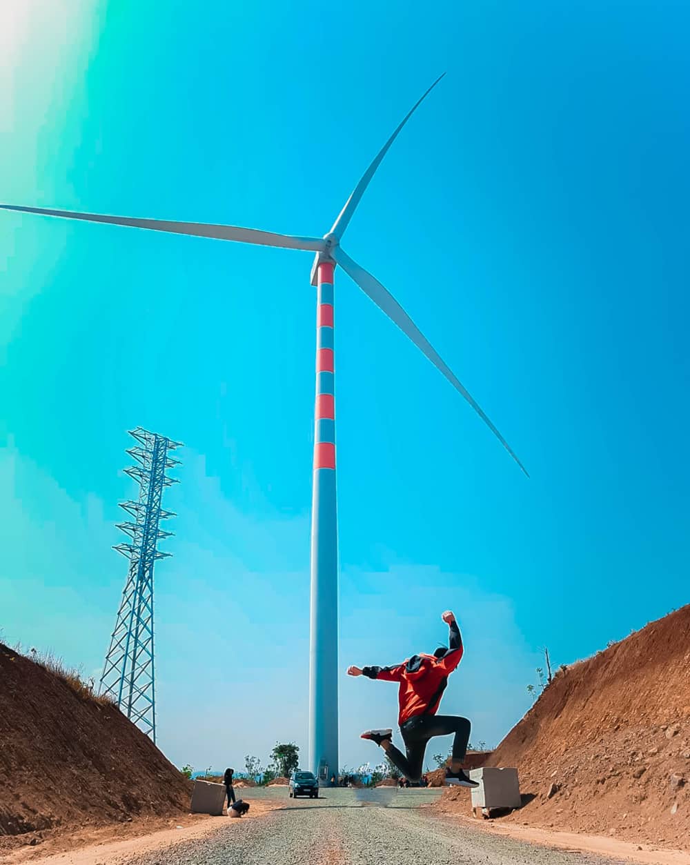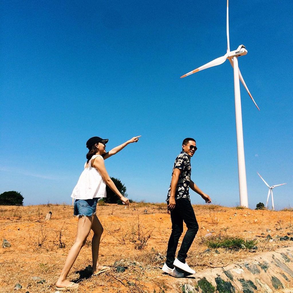 Công trình nổi tiếng Ninh Thuận có diện tích 9,6 ha với 16 trụ tua bin, bao quanh là đồng lúa và núi đồi chập chùng. Vì các trụ turbine tại đây có kích cỡ rất lớn, du khách nên đứng từ xa chụp hình để lấy được background toàn cảnh. Thời điểm chụp hình đẹp tại đây là vào lúc bình minh hoặc hoàng hôn. Ảnh: tonie_nguyen, greengrass2120.