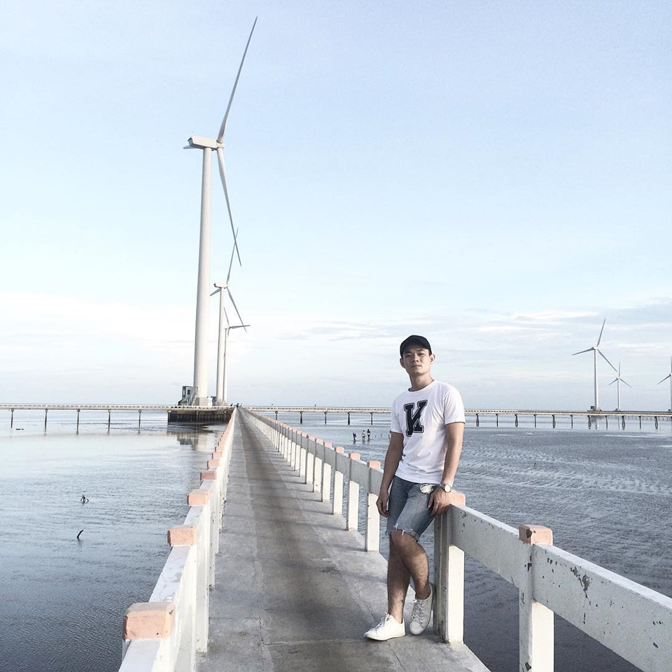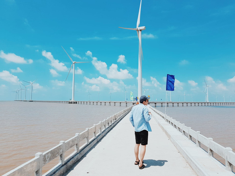 Nơi đây có tổng cộng 62 cột trụ và tua-bin quạt gió. Tuy nhiên, không phải chỗ nào trong khu vực này cũng có thể vào. Xung quanh cánh đồng điện gió là rừng đước ngập mặn. Do vậy, phong cảnh của địa điểm này càng thu hút nhiều bạn trẻ. Không những thế, giá vé vào cổng chỉ 20.000 đồng. Sau 16h là thời điểm lý tưởng nhất để tham quan cánh đồng điện gió vì nắng không quá gắt.