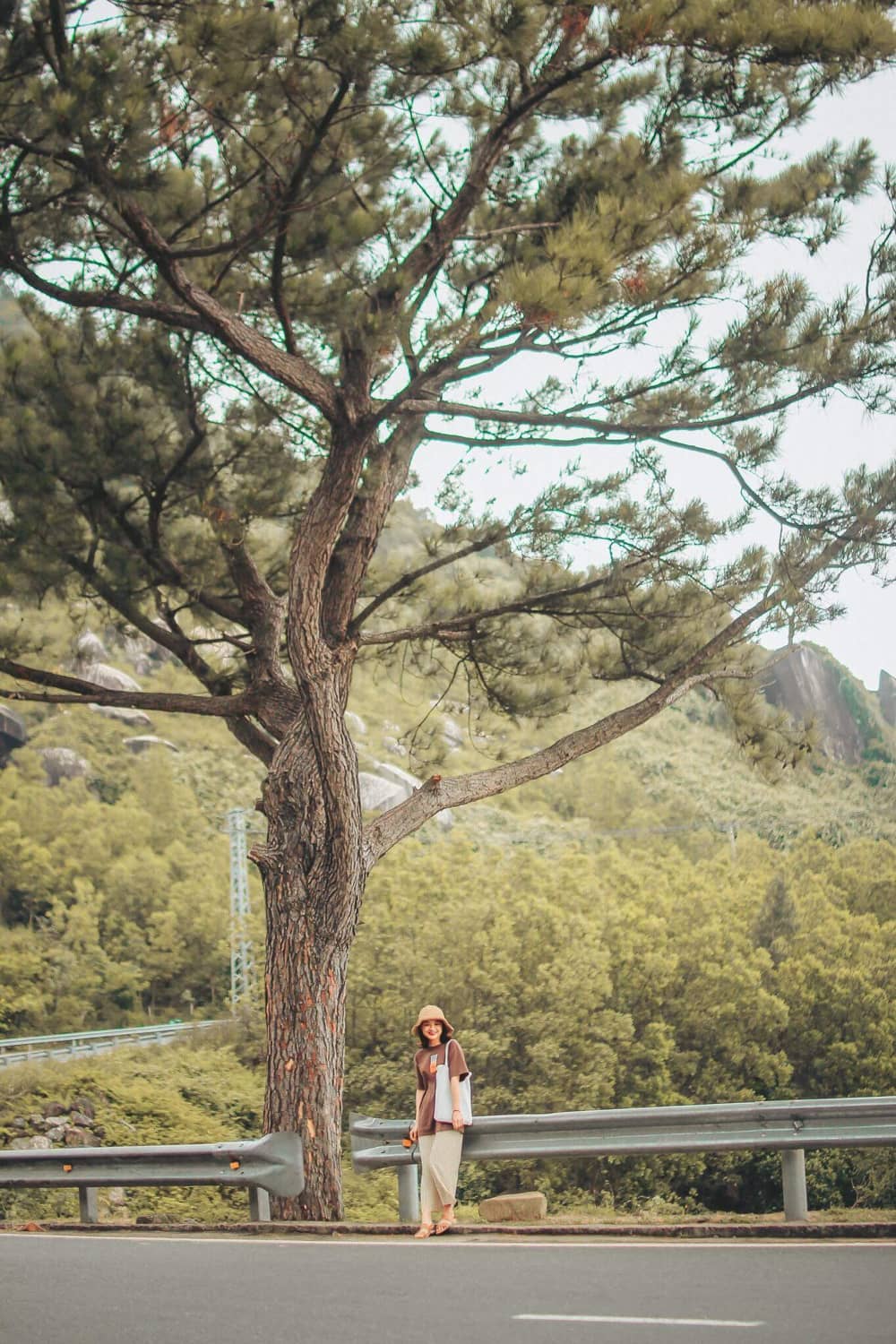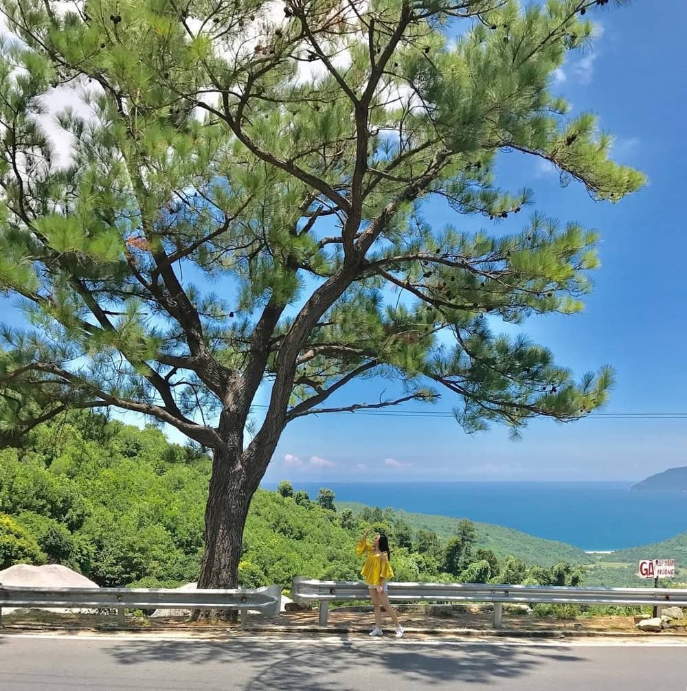 Nằm trên đèo Hải Vân, cây thông với tán lá rộng một mình đơn lẻ bên đường đã trở thành một tọa độ "sống ảo" lung linh được các bạn yêu thích.