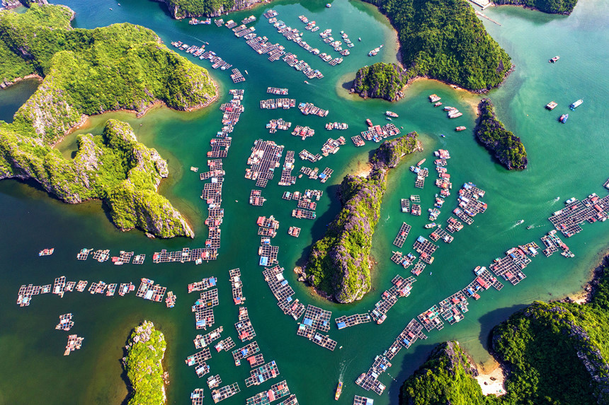 Dưới làn nước trong xanh là những bãi san hô nhiều màu. Những chiếc thuyền nhỏ xinh thấp thoáng giữa làn nước trong như pha lê. Trong vịnh có hơn 200 hộ dân sinh sống trên các ngôi nhà được thiết kế trên phao tạo thành làng nổi có tên Cái Bèo với lịch sử tồn tại hàng nghìn năm.