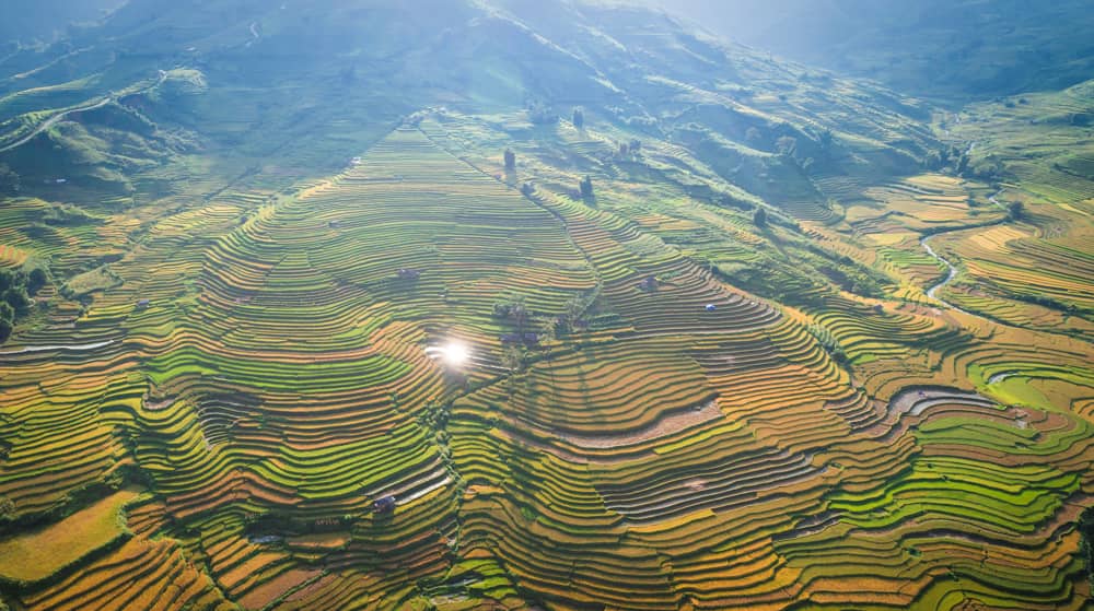Ruộng xếp tầng, xếp lớp trải rộng với vân xanh, vân vàng trải dài giữa bạt ngàn núi rừng Tây Bắc.