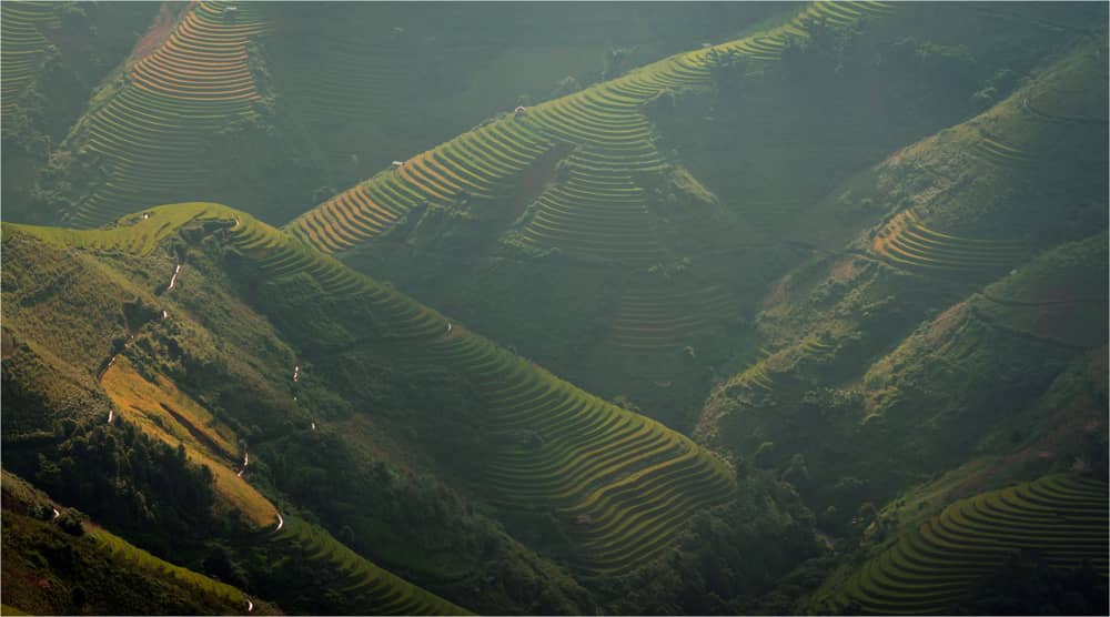 Từ trên cao nhìn bao quát khung cảnh, Mù Cang Chải đẹp như một bức tranh thủy mặc, từng đường vân xanh, vân vàng mềm mại ở mảnh đất có độ cao hơn 1.000 m này cứ tự nhiên mà đi vào lòng người.