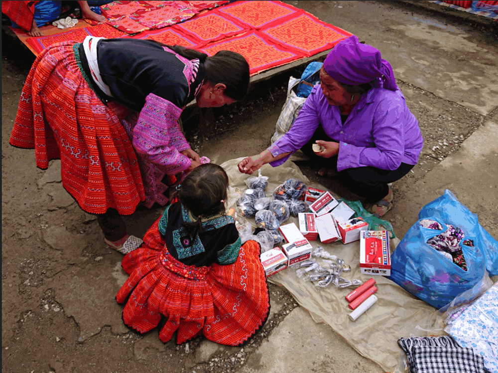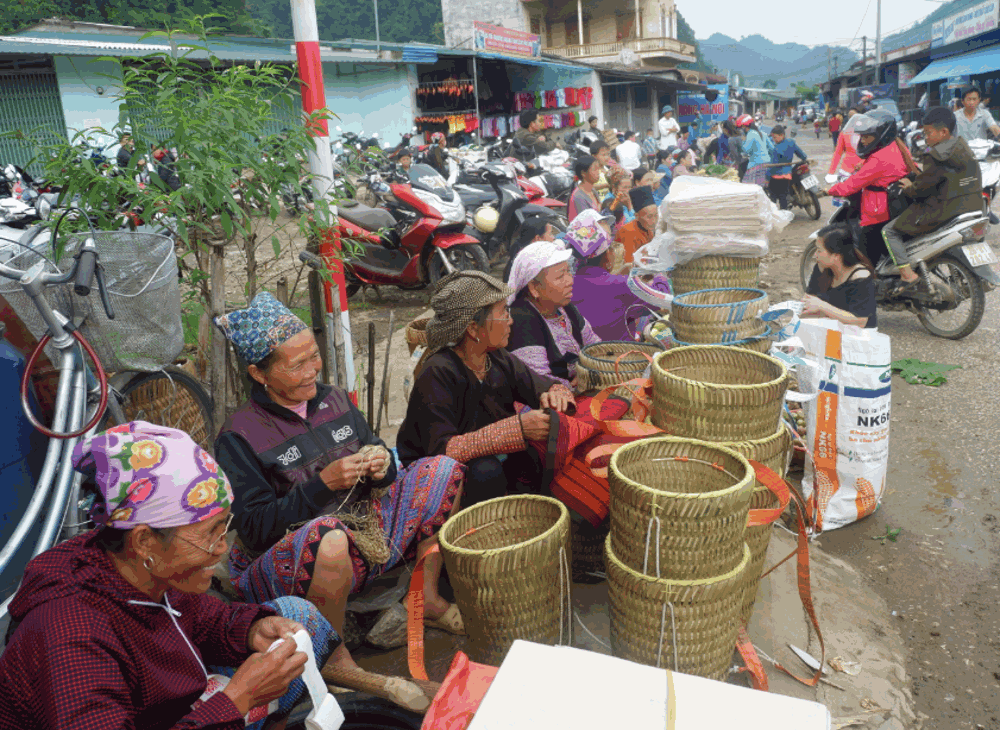 Các gian hàng ở đây khá đơn giản, chỉ là cái bàn gỗ, ít dây hay thanh gỗ dài vắt ngang vắt dọc treo sản phẩm, thậm chí là mảnh vải ni lông trải giữa nền gạch nhưng khách mua vẫn cứ kéo tới nườm nượp, chật cứng vòng trong vòng ngoài. Tiếng người trả giá pha lẫn trong tiếng cười nói giòn tan, ồn ào khiến không gian chợ bừng lên sức sống mãnh liệt giữa núi rừng yên bình.