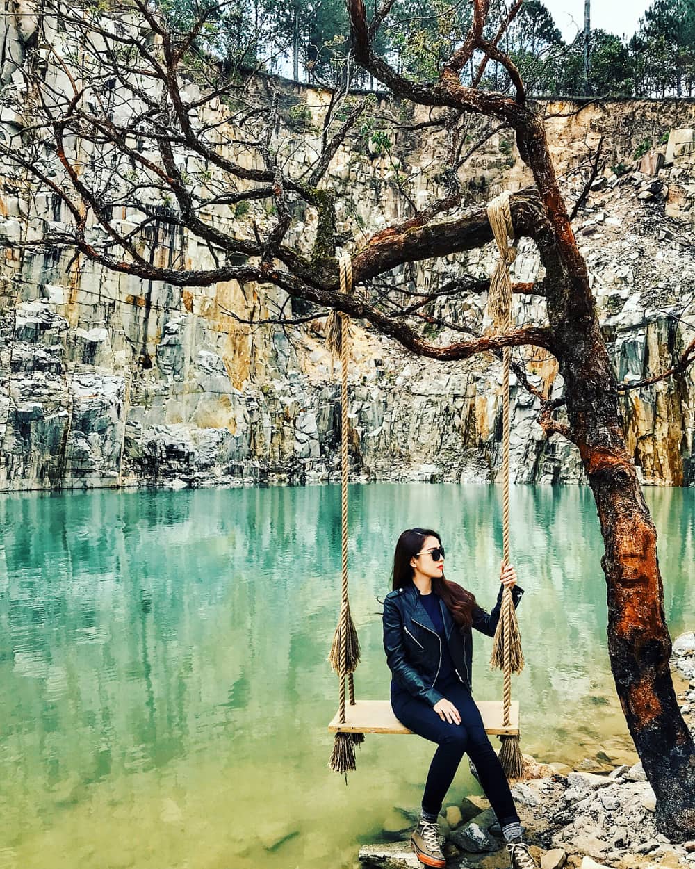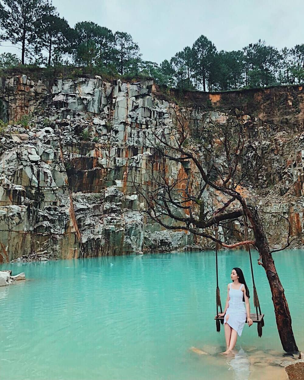 Tuyệt Tình Cốc thực chất là một mỏ đá hoa cương bị bỏ hoang nằm ở suối Cạn, xã Lát, huyện Lạc Dương, tỉnh Lâm Đồng. Sau thời gian dài không khai thác, mưa và các mạch nước ngầm đã tạo nên một hồ nước với màu xanh ngọc bích ảo diệu. Ảnh: @mhanh, @imbi.97.