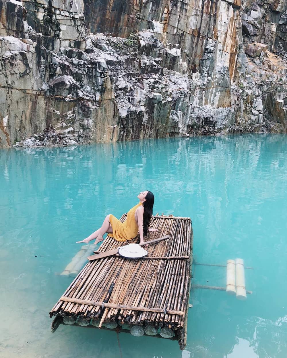 Chiếc bè duy nhất ở hồ nước là nơi nhiều người chờ đợi để được lên chụp ảnh. Bè có sẵn dây nối dài để một người trên bờ giữ lại, tránh trôi xa. Ảnh: @nyl.18.