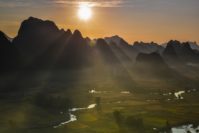 Hoàng hôn trên mùa vàng Phong Nậm, một xã biên giới của huyện Trùng Khánh. Tuy không nổi tiếng như ở Bản Giốc nhưng lại thu hút rất nhiều tay săn ảnh bởi cảnh đẹp mùa vàng hòa quyện với núi đồi trùng điệp.