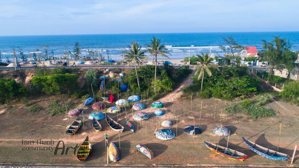 Làng bích họa Tam Thanh cũng có nhiều thay đổi so với lúc mới đầu hoàn thành để phục vụ du khách tốt hơn. Nhiều bức tường, căn nhà tháo dỡ và xây mới. Hay con đường thuyền thúng dựng lên với những chiếc thuyền trang trí đầy ấn tượng, xếp trong khoảng đất trống gần biển tạo nên một khung cảnh thú vị nhưng cũng rất bình yên. Ảnh: Hà Nguyễn.