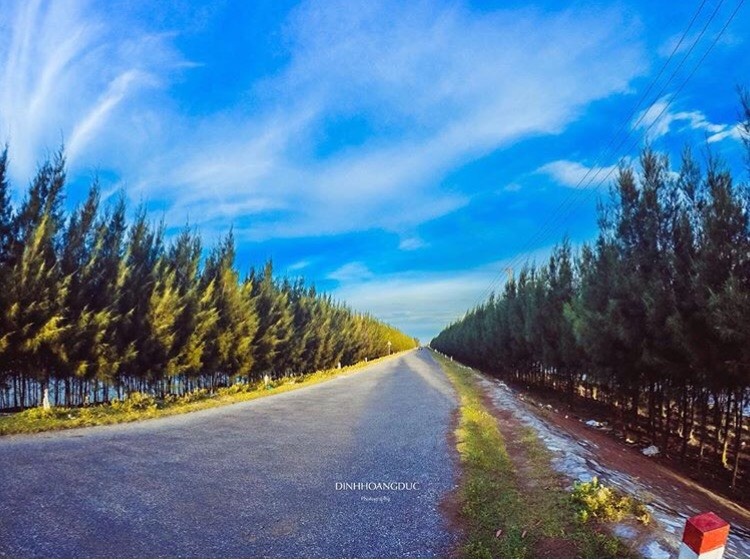 Một điều đặc biệt rằng, đường đi đến biển Cồn Vành đẹp vô cùng. Con đường trải nhựa dài uốn lượn, hai bên đường là những rặng phi lao xanh mượt, hoà cùng bầu trời trong xanh, tất cả tạo nên một vẻ đẹp nên thơ đến lạ kỳ.